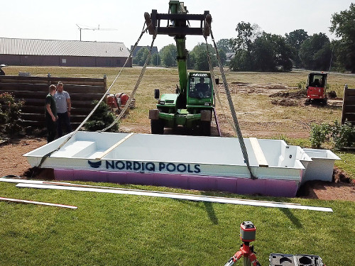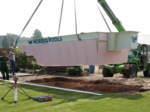 Mit einem Mobilkran, Teleskoplader oder ähnlichem kann der Pool auf die Bodenplatte gestellt werden. Danach wird er horizontal und vertikal ausgerichtet, damit er genau so steht wie geplant.