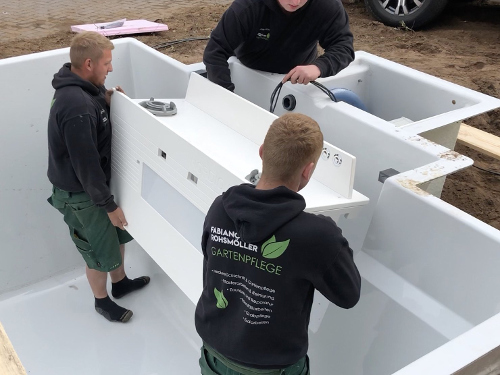 In Kooperation mit NORDIQ POOLS® sind wir in der Lage dies für Sie zu realisieren. Schauen Sie sich den Prozess gerne an. Der enorme Vorteil beim Einbau gegenüber klassischen Fertigbecken liegt in den nicht zu installierenden Rohrleitungen. Hierdurch werden Fehler, Risiko und Zeit beim Einbau des Pools reduziert. Die leicht zu installierende Technik macht einen hochwertigen Poolbau an 2-3 Tagen möglich.