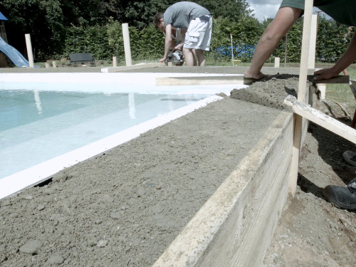 Diese kann mit Magerbeton oder Isolierbeton erfolgen. Hinterfüllt wird parallel mit steigendem Wasserstand im Pool. Einfach eine Schnur von Beckeninnenkante zu Innenkante spannen, damit die Wand spannungsfrei eingebaut werden kann.